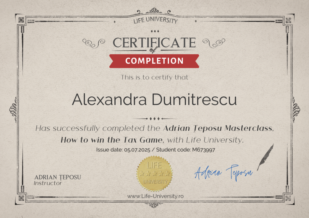 În plus, după finalizarea cu succes a cursului Cum să câștigi jocul taxelor cu Adrian Țeposu și a examenului grilă, vei primi: