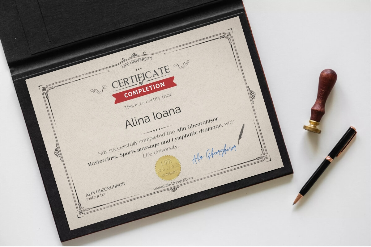 În plus, după finalizarea cu succes a cursului de Masaj Sportiv cu Alin Gheorghișor și a examenului grilă, vei primi: