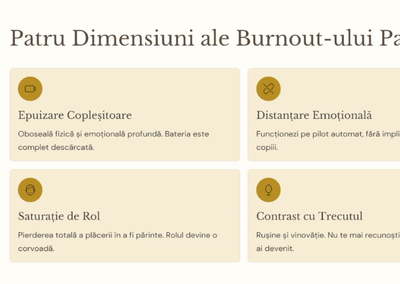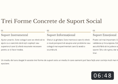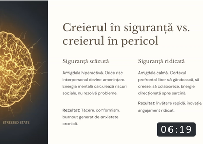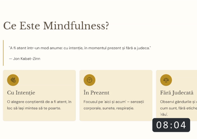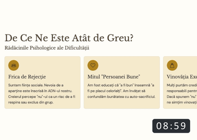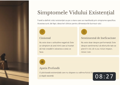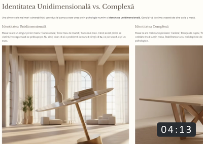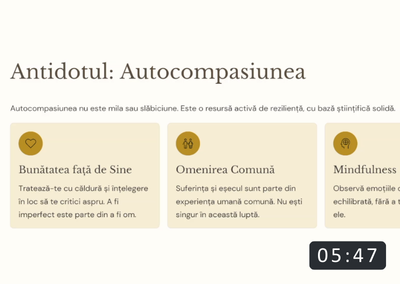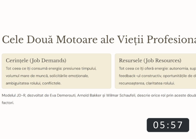 Dincolo de teorie, cursul este o călătorie practică spre reconstrucție, unde vei primi o trusă completă de instrumente personalizate pentru gestionarea energiei și a emoțiilor. Vom explora manifestările epuizării în toate contextele vieții, de la mediul profesional la rolurile personale, construind pas cu pas un plan de acțiune adaptat nevoilor tale unice.