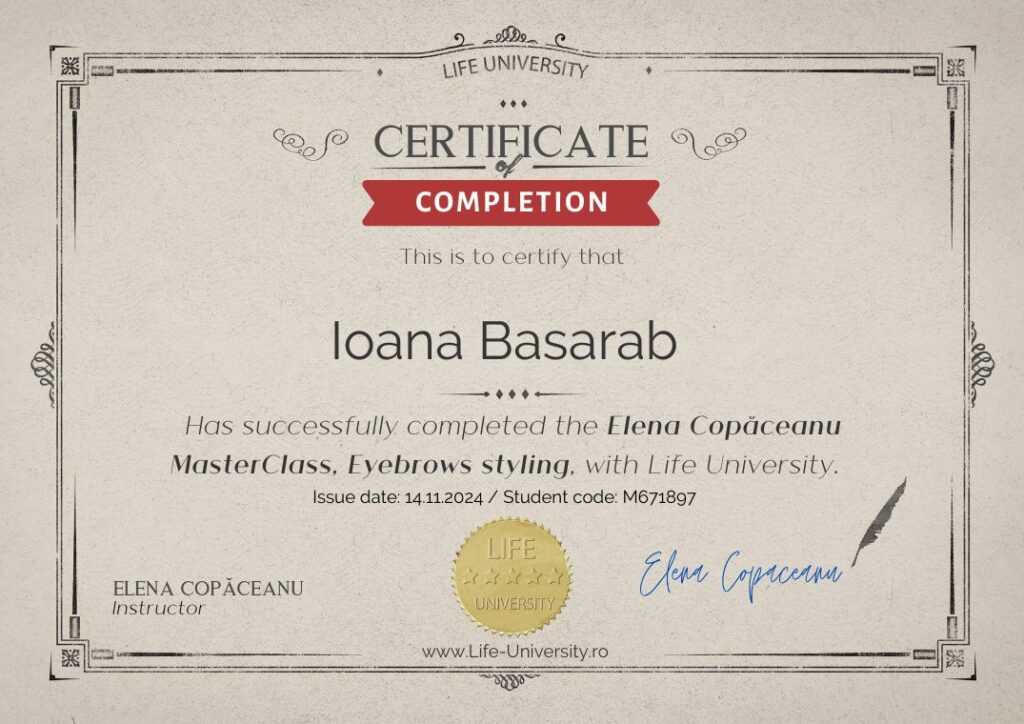 În plus, după finalizarea cu succes a cursului de Stilizare Sprâncene cu Elena Copăceanu și a examenului grilă, vei primi: