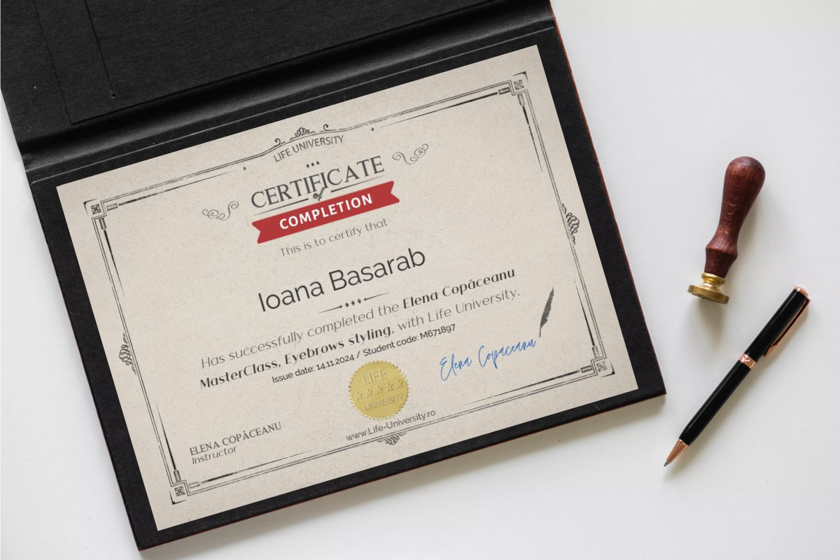 - Un certificat digital, printabil, conform mostrei de mai jos, emis sub egida Life University. Acesta este un certificat care poate fi trecut în CV și poate reprezenta un plus.