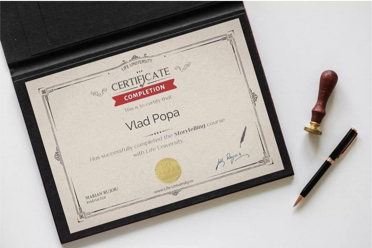 În plus, după finalizarea cu succes a cursului de Storytelling și a examenului grilă, vei primi: