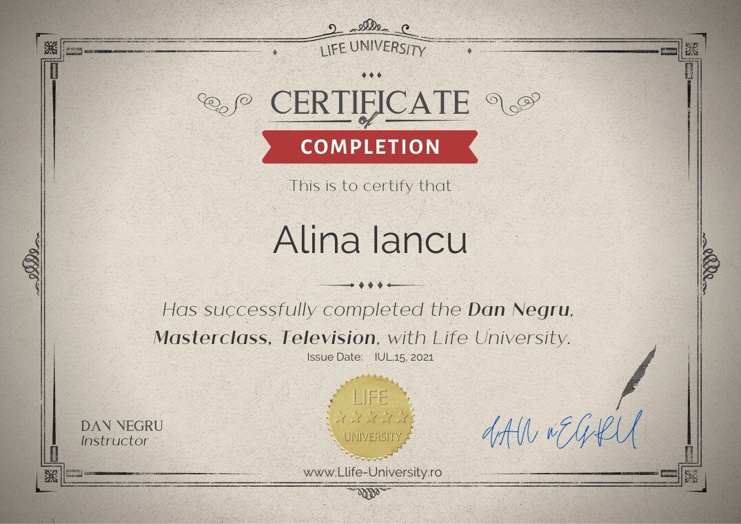 Un masterclass cu informații prețioase mai ales pentru cei care sunt la început de drum în media. Am urmărit cu interes tot cursul și pot spune că cel mai mult mi-au plăcut poveștile despre experiențele din viața lui Dan Negru, dar și sfaturile pe care le-a oferit pe parcursul seminariilor.
