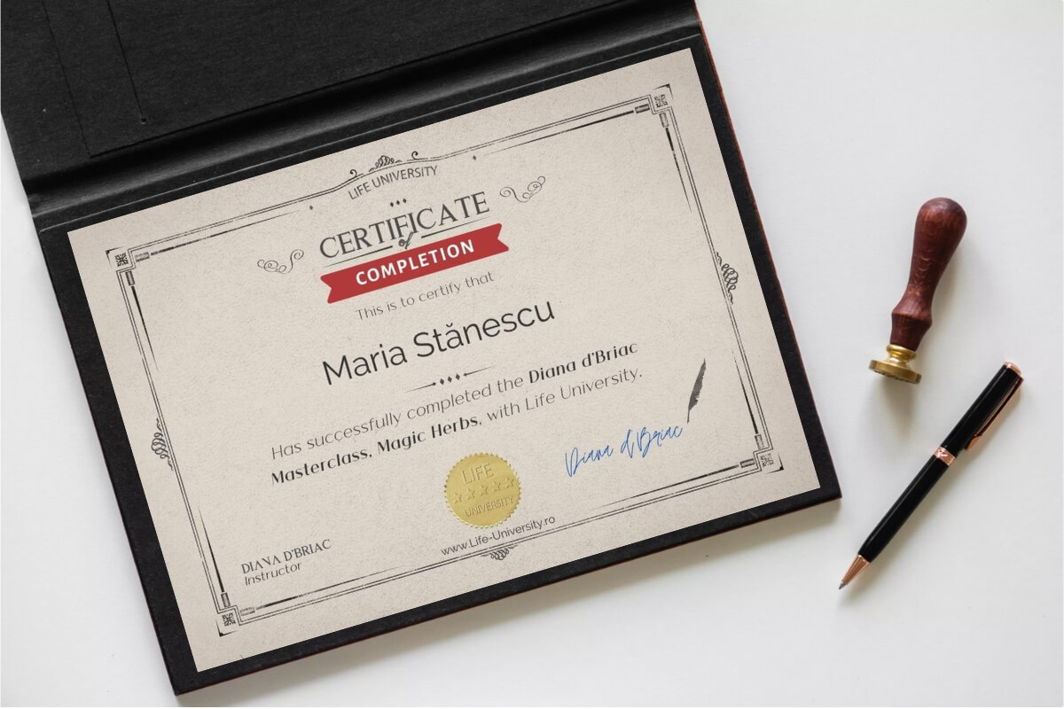În plus, după finalizarea cu succes a cursului de Ierburi Magice cu Diana d’Briac și a examenului grilă, vei primi: