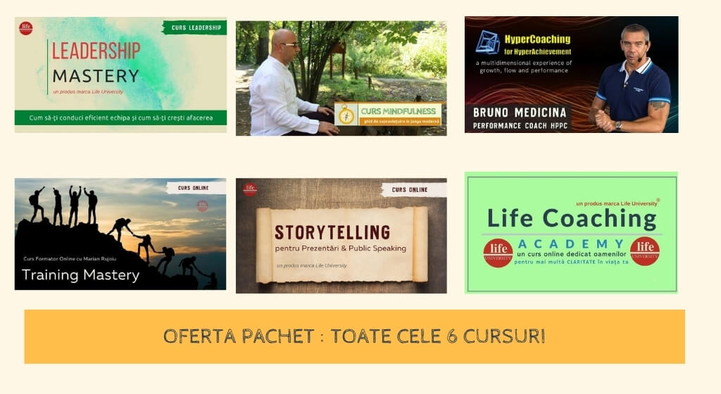 Pachet 6 cursuri: Hypercoaching + Life Coaching + Training Mastery + Mindfulness + Storytelling + Leadership Mastery (P14)